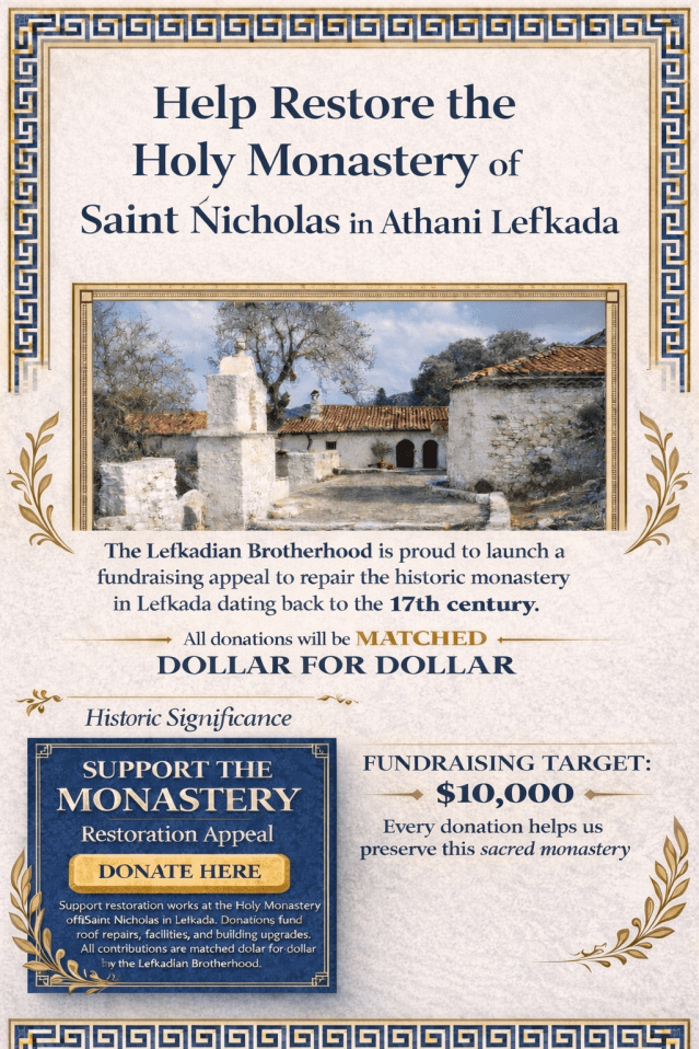 A commemorative plaque in the name of the Lefkadian Brotherhood will be installed at the monastery in recognition of this fundraising effort and the generosity of donors, creating a lasting tribute to our community’s commitment to preserving Lefkada’s spiritual heritage.