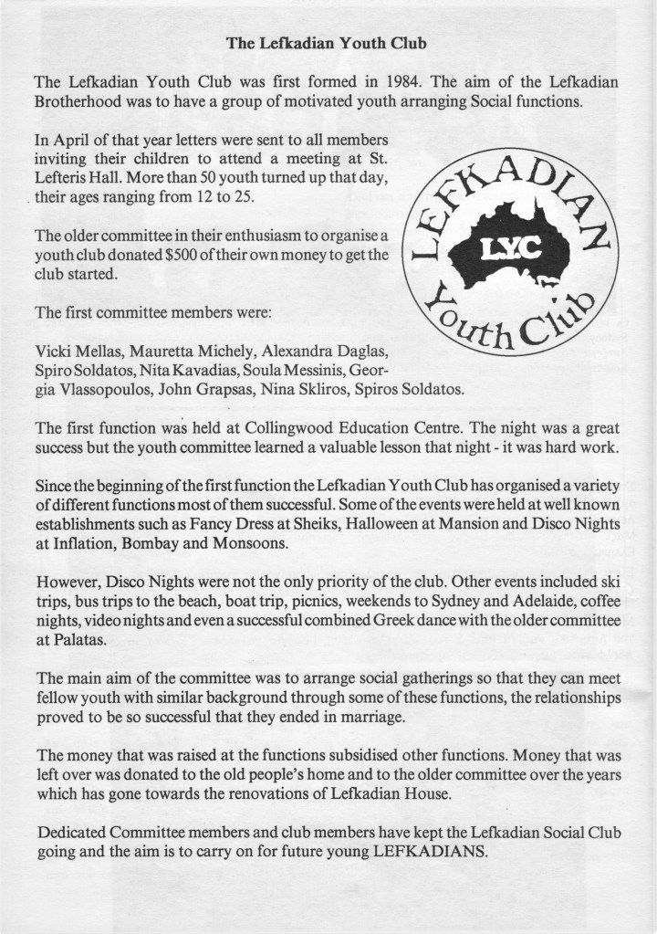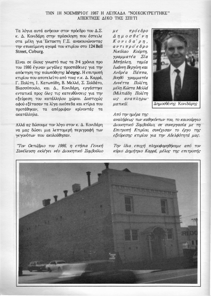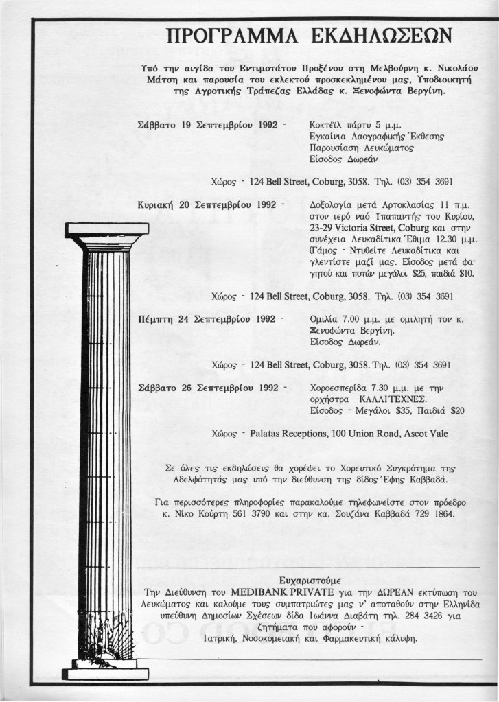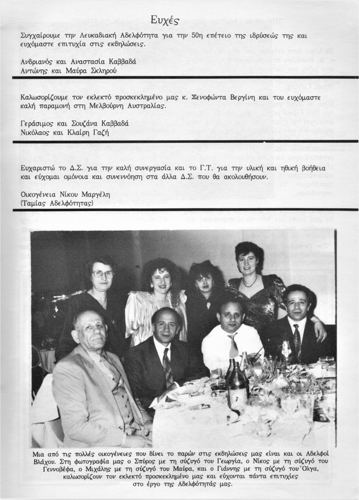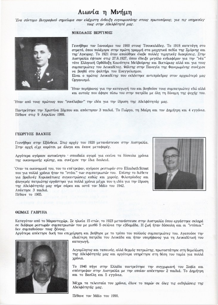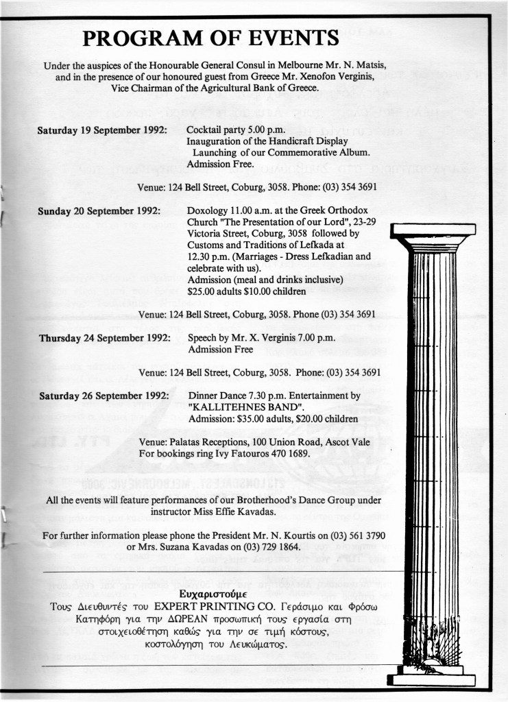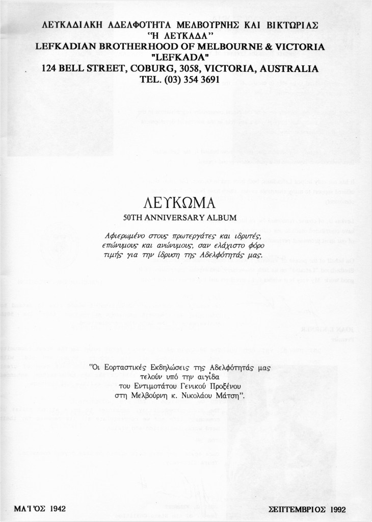 The Brotherhood 50th Anniversary Commemorative Album reflects back in 1992 upon the proud achievements of the Brotherhood leading up to (and beyond) the purchase of the hall in November 1987, the Lefkaditiko Spiti a home where all Lefkadians and Meganisians are welcome.